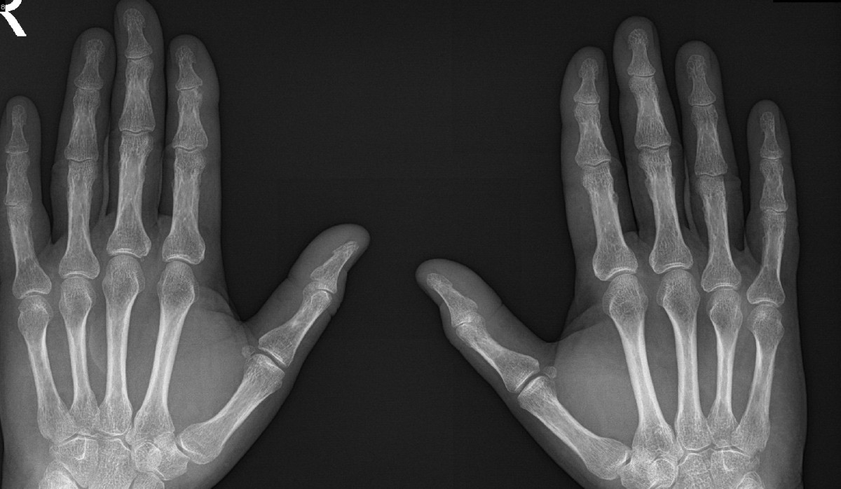 Našel jsem ale také jeden podobný obraz band-osteolysis na Radiopedii (radiopaedia.org/articles/acro-osteolysis-1 ), který je připisován hyperparathyreoze, a další v jiné publikaci (Colquhoun M, Penn H. Band acro-osteolysis in systemic sclerosis. Rheumatology (Oxford). 2021 Oct 2;60(10):4945. doi: 10.1093/rheumatology/keab031. PMID: 33493313, pubmed.ncbi.nlm.nih.gov/33493313/), který je u sklerodermie. U obou těchto diagnóz, pokud jsou publikovány obrázky akro-osteolýzy, tak jsou ale většinou terminálně, tedy vypadají jinak.