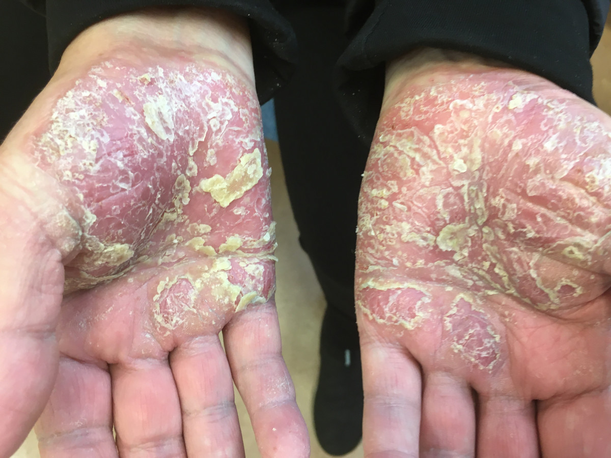 Obrázek dlaní je z klidnějšího období (částečně zhojen po aplikaci Diprophosu, který jediný přináší pacientce dočasnou úlevu, predniosn byl vysazen 6/2024) plosky bývají horší s hlubokými ragádami.