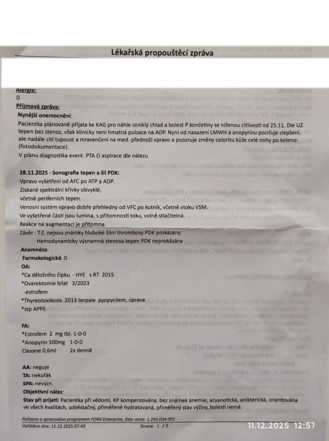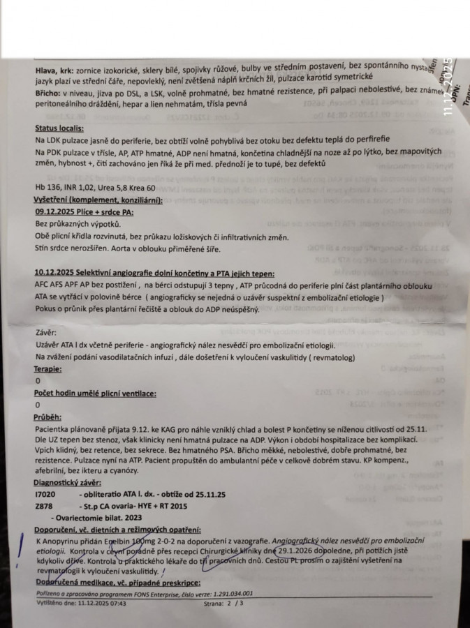 OA: Jedná se o ženu 45 let, která 2015 měly HYE pro ca cervix uteri s následnou RT, 2023 preventivní ovarectomie. substituce Estrofen. Na onkologické kontroly chodí, bez zn, recidivy. V roce 2013 po porodu prodělala thyreotoxikozu, nyní je bez léčby, TSH opak. v normě, UZ š.ž. bez pozoruhodnotí. Kromě Estrofenu nic neužívá, je veganka, sportuje. AA: neg. Nekouří. NO: 25.11.25 po trochu větší pochůzce po městě pobolívání v nártu PDK. Během několika dnů se potíže rozšířily na celý bérec. Končetina byla teplá, lividně zbarvená. Pro vyšší D dimery a susp. na FT odeslána 28.11.na Urgent, zde UZ žil i tepen v normě. Po několika dnech končetina chladná, necitlivost prstů od poloviny nártu distálně, bledost se střídá s lividitou, při chůzi bolest a brnění prstců. Tento stav se nezlepšuje ani nehorší. Jiné potíže nemá. Základní lab. v normě, jen vyšší procent. zastoupení eosinofilů. Sedimentace nebyla nabrána. Při th. ter. dávkou NMWH bez zlepšení, do medikace přidán i ANP. 9.12. angio tepen PDK- uzávěr ATA vč. periferie. Z hosp. dop. na cévním dop. revmatol.vyš., NMWH ex, místo něj Enelbin 2-0-2 + ANP. Ko na cévním koncem ledna.