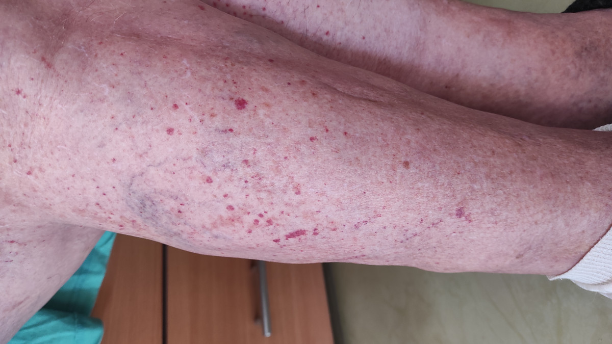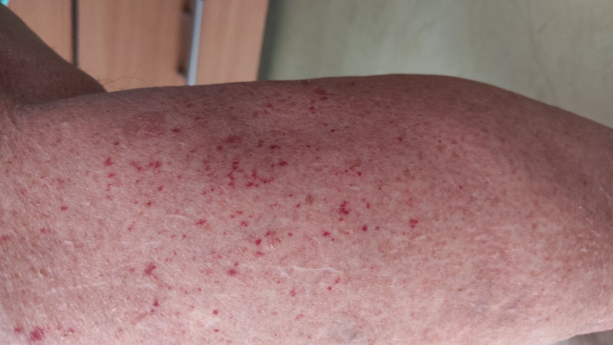 30.09.2024 16:48 návštěva: obj.: petechiální výsev mizí a zase se objevuje, jsou jednotlivé tečky až drobně splývavé, při kompresi neblednou, nejsou nad niveau, jsou omezeny pouze na kůži DK. Pacientku nesvědí, nebolí, celkově se jinak cítí dobře. základní LAB bez pozoruhodností.