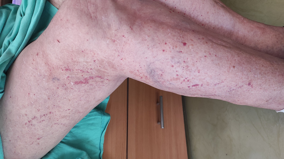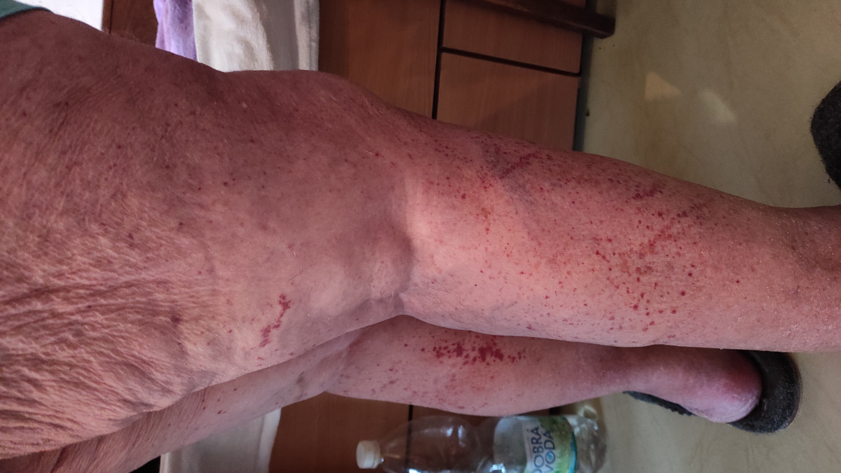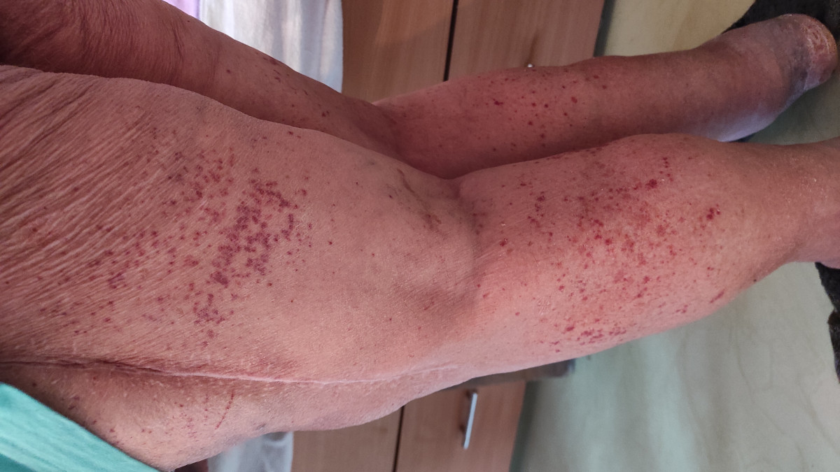 Dobrý den, 23.09.2024 ....návštěva u 84leté pacientky: asi od 16.9. byla nemocná, příznaky infekce horních dých. cest. Ležela 3 dny, nyní je to dobré. Asi 17.9. si všimla rozsáhlejší sufuze na lat. straně PDK, 21.9. se udělaly drobnější tečky i na lat. straně LDK.. Obj.: chůze v chodítku, eupnoe, afebrilní, AS klidná, pravidelná, dýchání sklípkové, DK bez větších otoků, TK:140/80 na lat. stranách DK. nikde jinde jsou petechiální projevy charakteru vaskulitidy? dop. náběr krve, dle toho další vs. vaskulitida při infekční nemoci? zatím se další nepalpovatelná purpura netvoří,