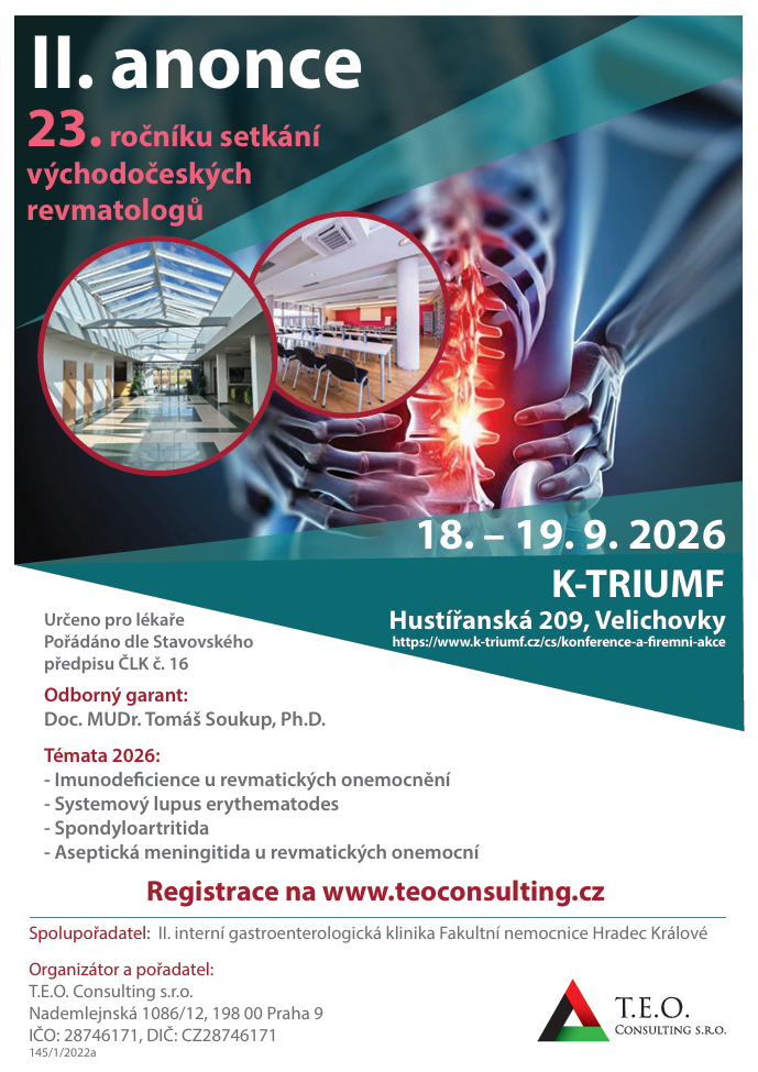 Srdečně vás zveme na tradiční, již 23. ročník Setkání východočeských revmatologů, který se uskuteční ve dnech 18.–19. září 2026. Odborný program pod záštitou garanta doc. MUDr. Tomáše Soukupa, Ph.D. proběhne v příjemném prostředí komplexu K-TRIUMF ve Velichovkách. Přijďte diskutovat o novinkách v oboru a sdílet zkušenosti s kolegy v rámci tohoto oblíbeného regionálního setkání.
