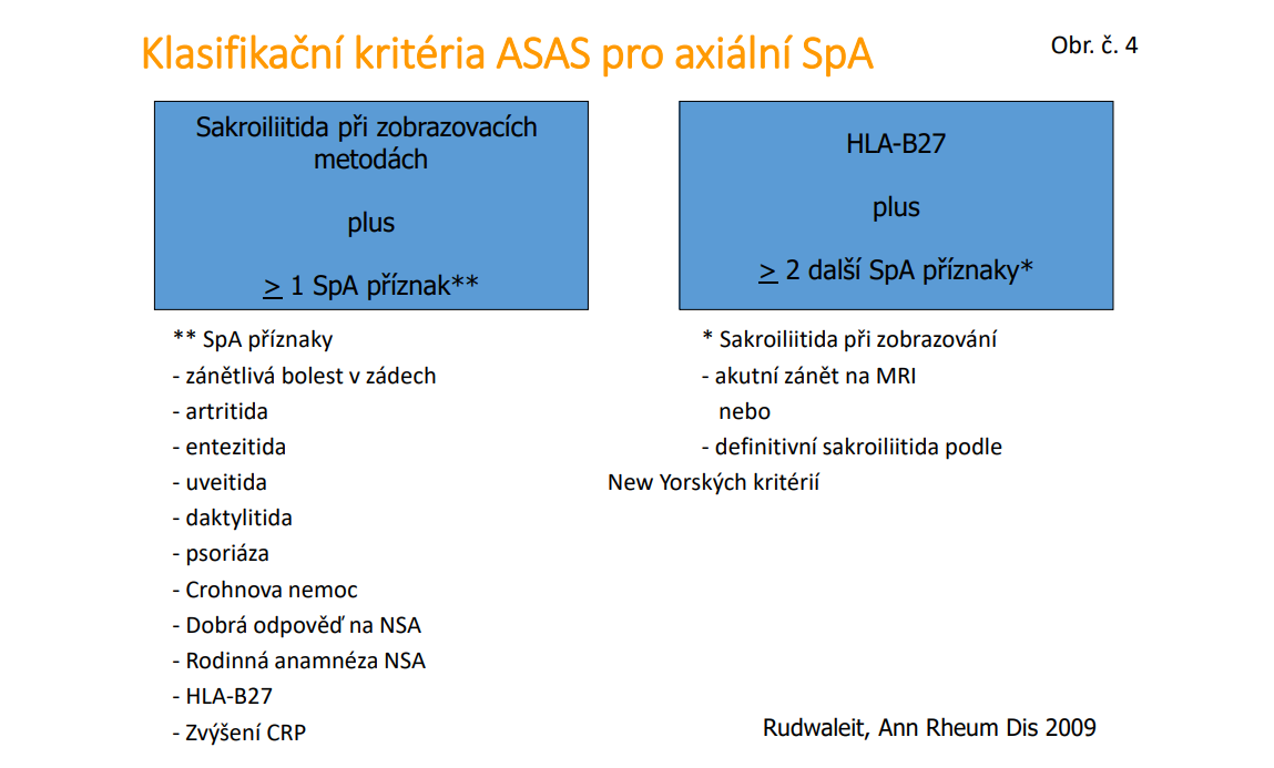 Základním kritériem je chronická bolest v dolních zádech trvající déle než tři měsíce u osob mladších 45 let. Dále lze splnit kritéria buď v tzv. větvi zobrazovací, kdy pacient má nález sakroiliitidy při zobrazovacích metodách /ale nemusí být na rtg, může být na MRI/ a jeden další příznak, nebo ve větvi klinické, kdy podmínkou je positivita antigenu HLA B 27 a přítomnost dalších dvou kritérií. Je nutné zdůraznit, že součástí kritérií je nová definice tzv. zánětlivé bolesti v zádech. /Obr.č. 5/.